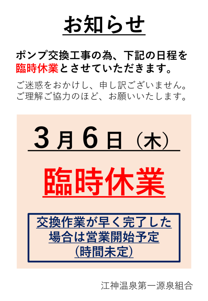 【3月6日(木)】ポンプ交換工事に伴う臨時休業について